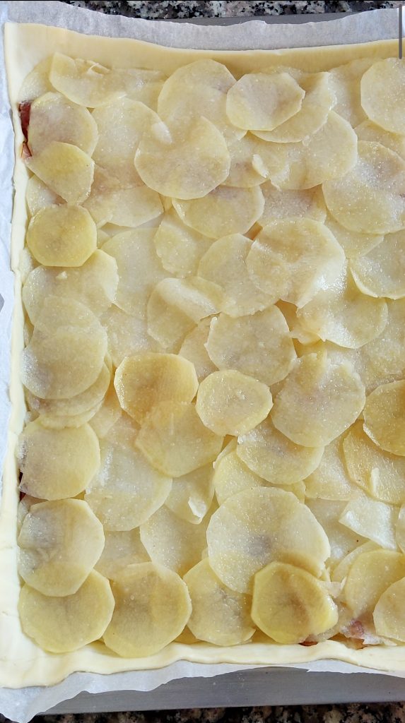 Épluchez les pommes de terre. Lavez-les et avec l’aide d’une trancheuse ou mandoline réduisez-les en fines tranches. Étalez un rouleau de pâte feuilletée rectangulaire dans une plaque rectangulaire tapissée de papier sulfurisé. La plaque que j’ai utilisée mesure 30 x 25 cm.