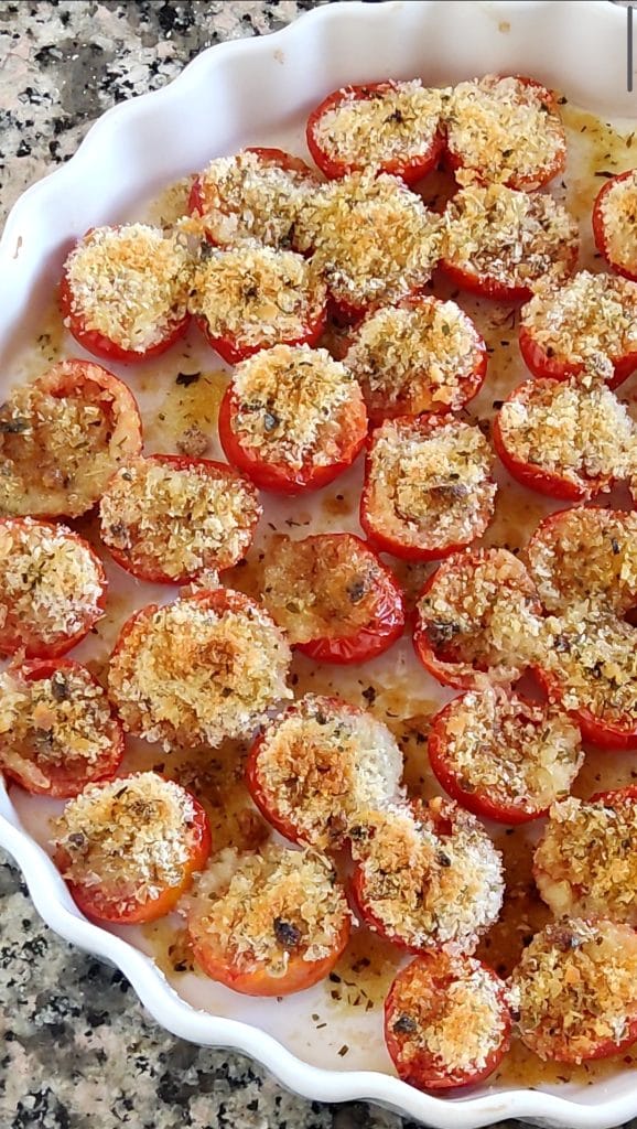 Tomates cerises gratinées simples à préparer et délicieuses. La recette que je veux vous raconter aujourd’hui est une simple recette pour préparer des tomates cerises d’une manière savoureuse et spéciale. Douces tomates cerises farcies avec une panure simple et savoureuse puis gratinées au four. Elles sont si bonnes que chez moi elles ont disparu en un rien de temps, je vous avoue que je les ai mangées même pendant que je prenais la photo! Elles se préparent en quelques minutes et disparaissent tout aussi vite! Les Tomates cerises au four sont un accompagnement parfait pour accompagner des plats de viande ou de poisson. Profitez donc des douces tomates cerises qui sont maintenant en pleine saison et préparons ensemble les Tomates cerises gratinées