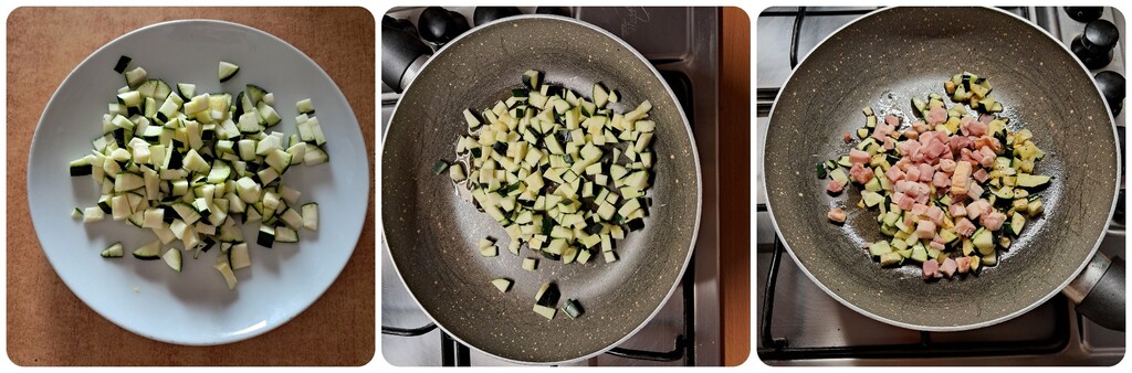 Ajoutez les courgettes coupées en petits dés, salez et laissez cuire environ 8 minutes, en remuant souvent.