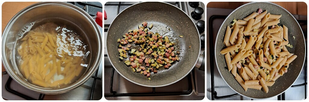 Égouttez les pâtes al dente et faites-les revenir dans la poêle avec les courgettes et les lardons.
