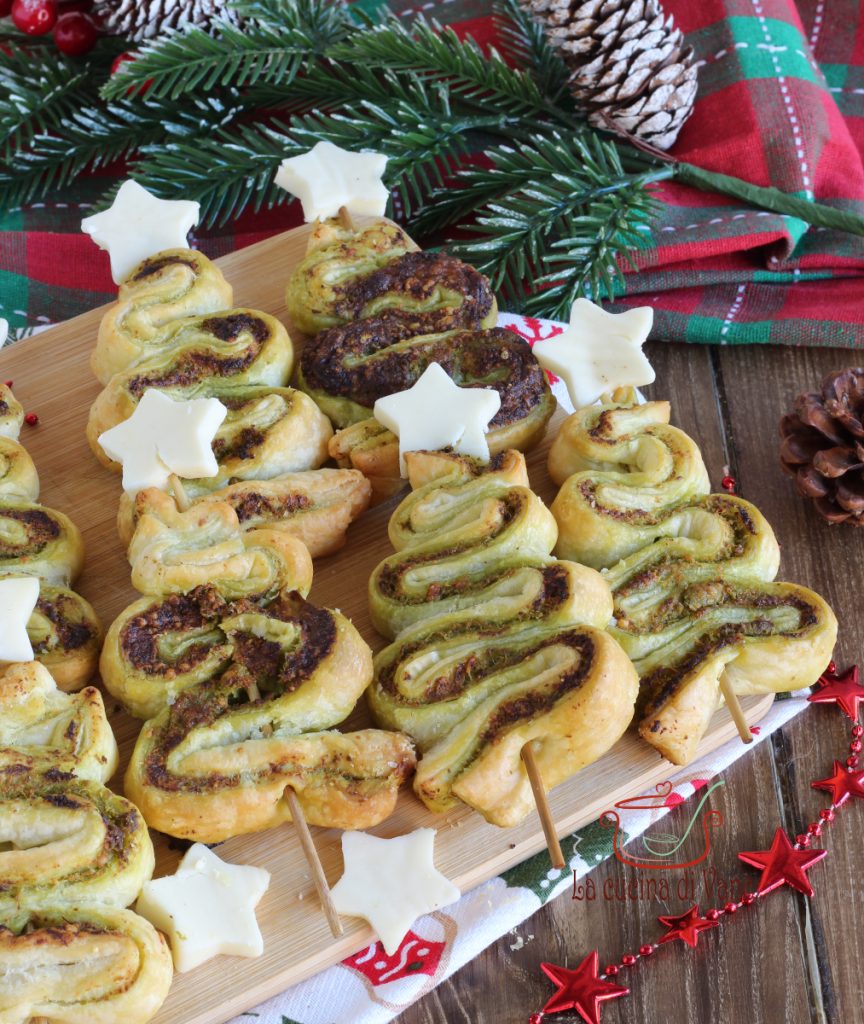 Voici une idée savoureuse et très jolie à préparer à Noël comme apéritif mais aussi comme amuse-bouche, prépare avec moi les SAPINS EN PÂTE FEUILLETÉE farcis avec du pesto de pistache et du parmesan. Ces délicieux sapins se préparent sans emporte-pièces, il te faudra seulement un rouleau de pâte feuilletée et des pics à brochettes, ils se préparent en cinq minutes et se servent sans attendre à table.
