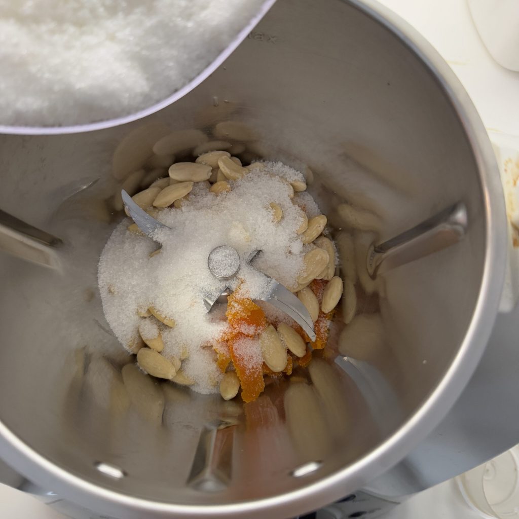 Mettez le zeste d’une demi-orange et les amandes pelées dans le mixeur.