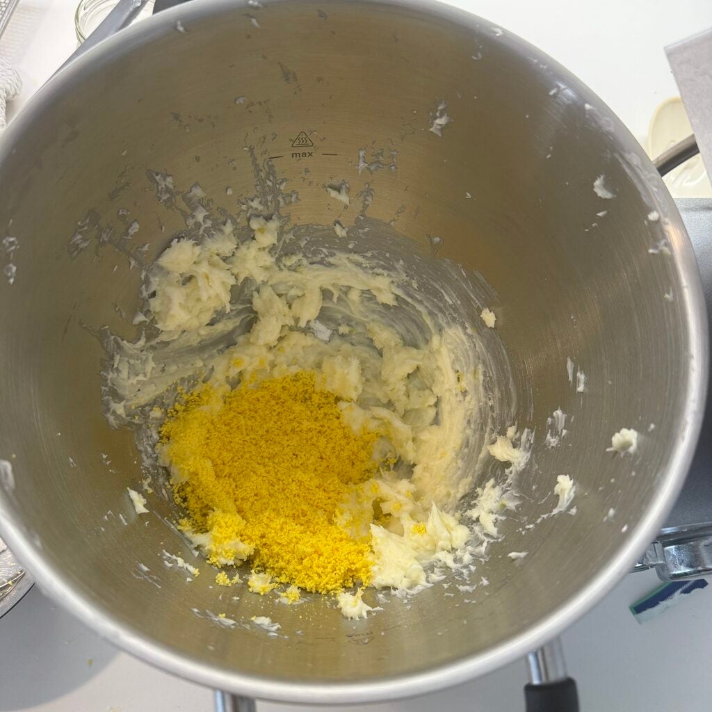 Dans le bol du robot culinaire, mettez le beurre mou, le sucre, le zeste de citron râpé et la vanilline (ou l’extrait de vanille). Mélangez jusqu’à obtenir une crème.