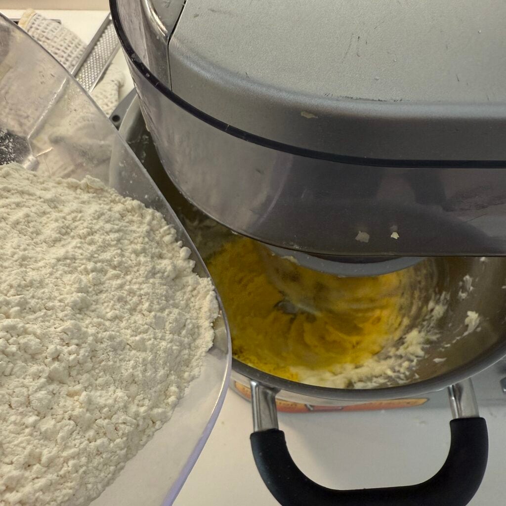 Ajoutez les jaunes d’œufs tamisés dans le bol du robot culinaire et continuez à travailler la pâte.