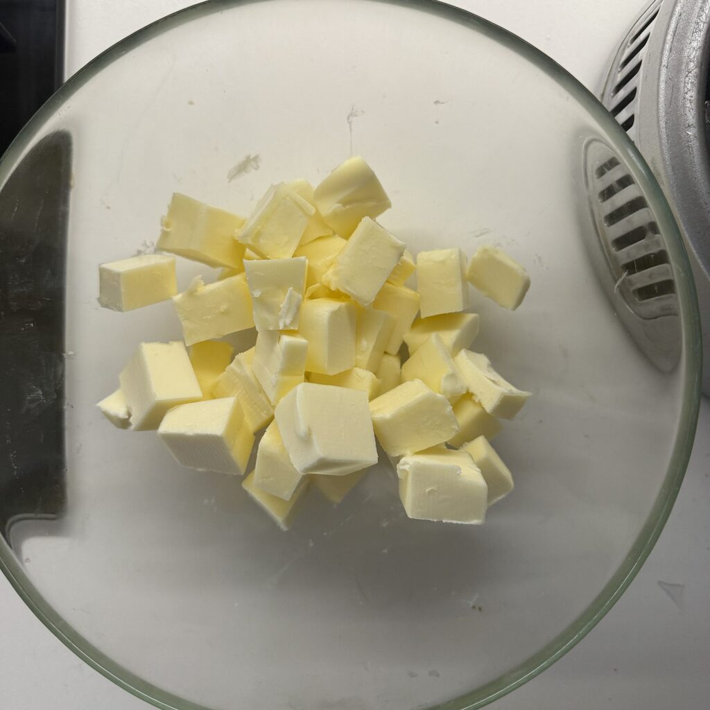 Coupez le beurre mou en morceaux et versez-le dans le bol avec les autres ingrédients.