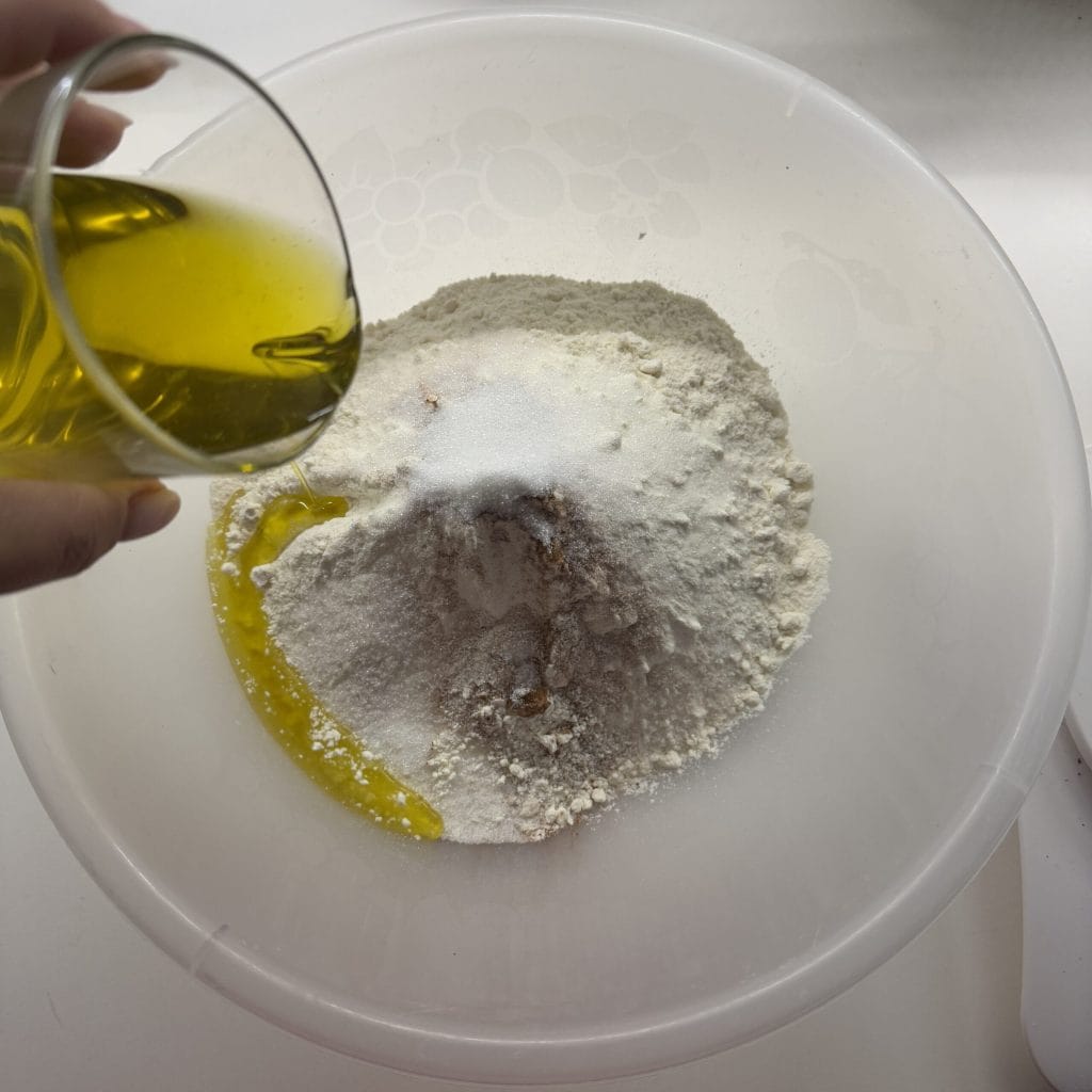 Ajoutez l’huile d’olive et le vin blanc tiède