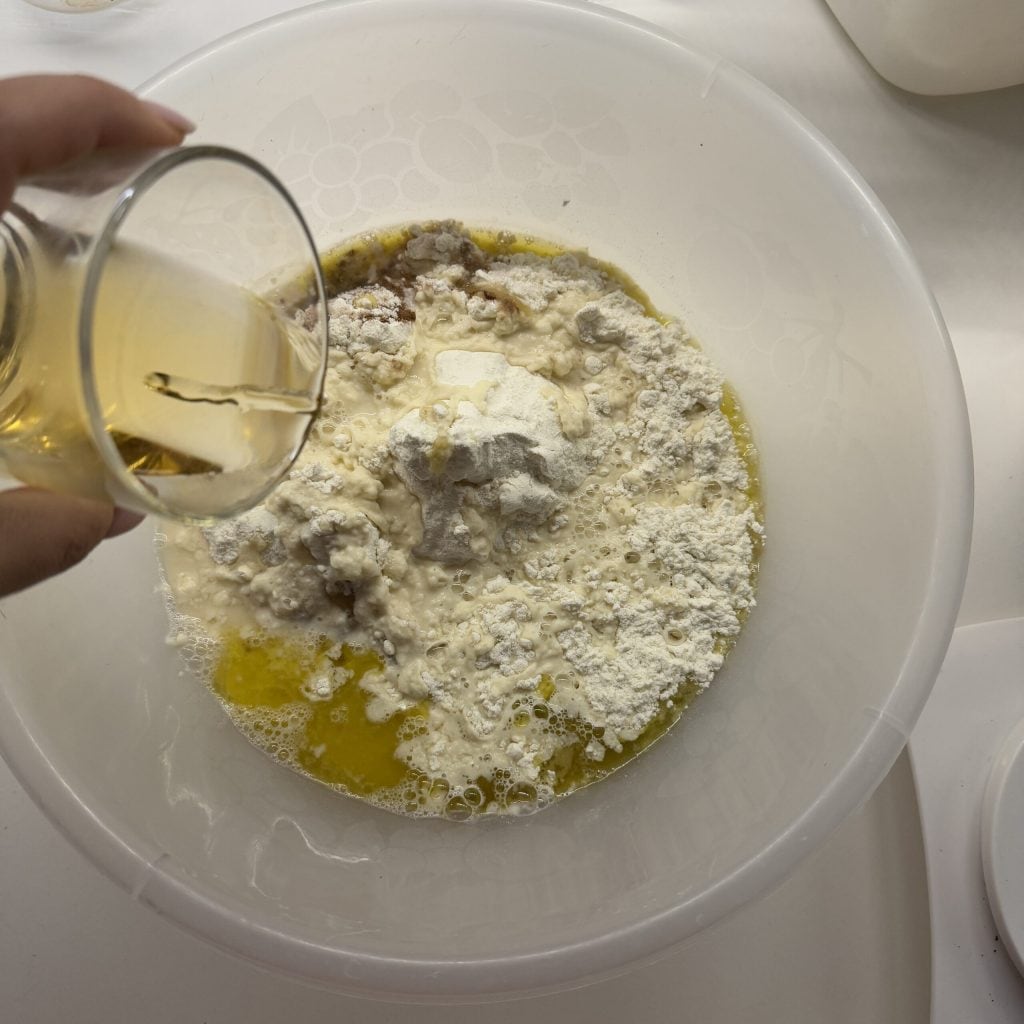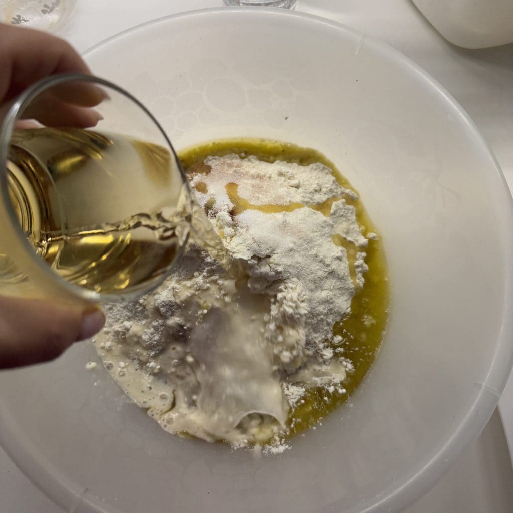 Passez maintenant à la préparation de la pâte. Je conseille d’utiliser du vin tiède ou à température ambiante.