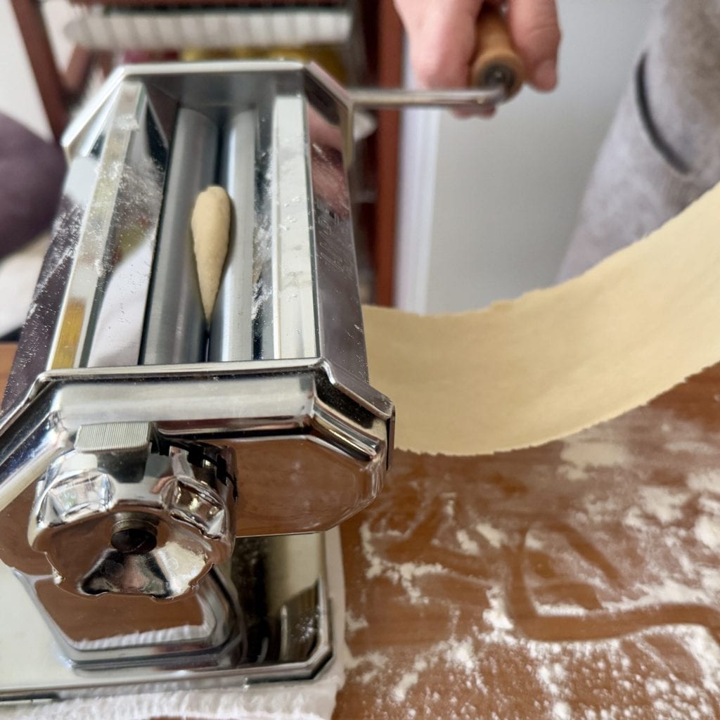 Une fois la première feuille obtenue, repliez-la sur elle-même et repassez-la dans les rouleaux de la machine à pâtes. Répétez cette opération 2-3 fois, en resserrant les rouleaux à chaque fois. Vous devez arriver à la première position, celle qui fait la feuille la plus fine.