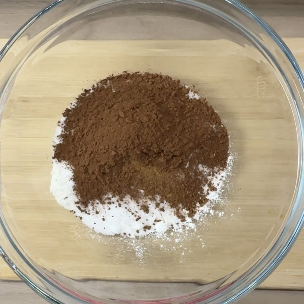 Ajoutez la farine, la cannelle, le bicarbonate et le cacao. Mélangez 30 sec. vit 2.