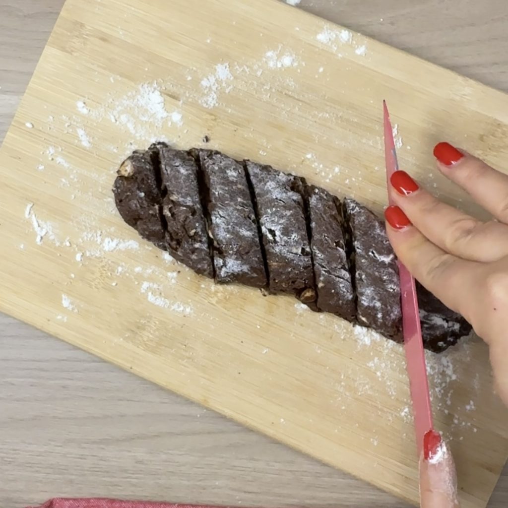 Farinez légèrement le plan de travail, créez un boudin de 3-4 cm de largeur, aplatissez-le légèrement, puis commencez à couper les castagnelle en biais à une épaisseur d’environ 1,5 centimètre.
