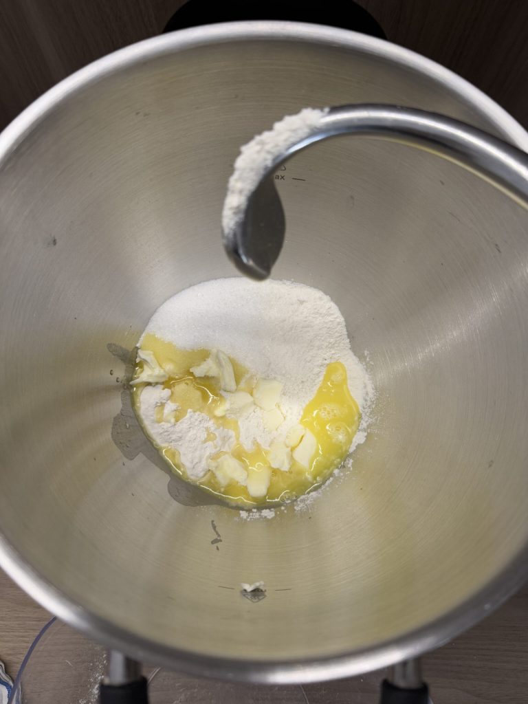 Dans le mélangeur, insérez la farine, le sucre semoule et le beurre mou.