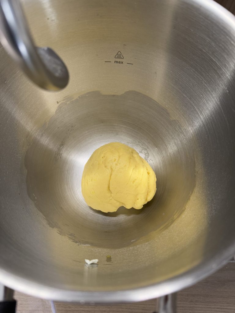 Prenez la pâte dans le bol du mélangeur, aplatissez-la à environ 1-1,5 cm d’épaisseur et enveloppez-la dans du film plastique.