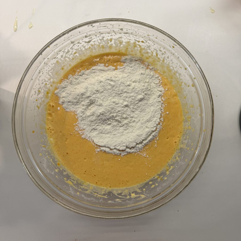 Ajoutez aussi la farine et la levure tamisées : 40 sec. vit. 4.