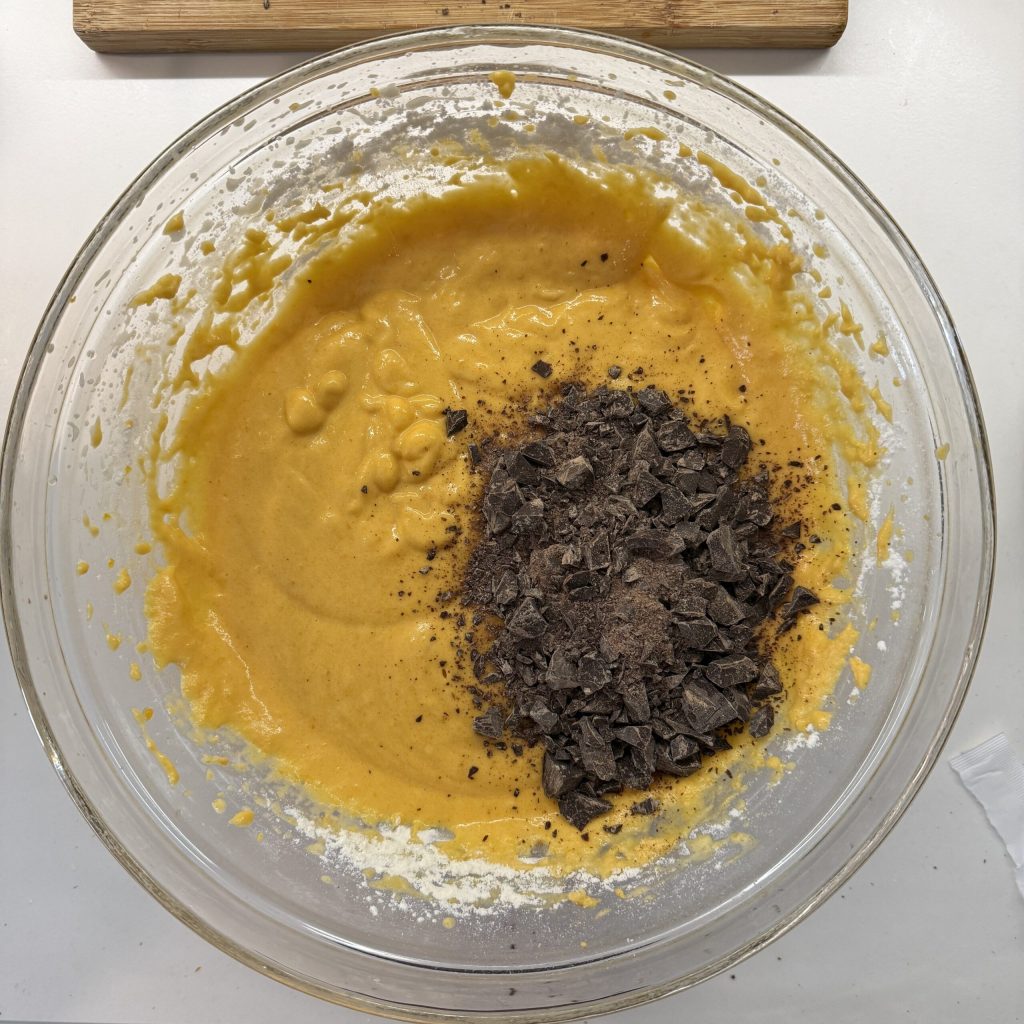 Versez le chocolat haché dans la pâte du gâteau, en laissant un peu de côté pour la surface. Mélangez avec une spatule de bas en haut pour répartir le chocolat uniformément.
