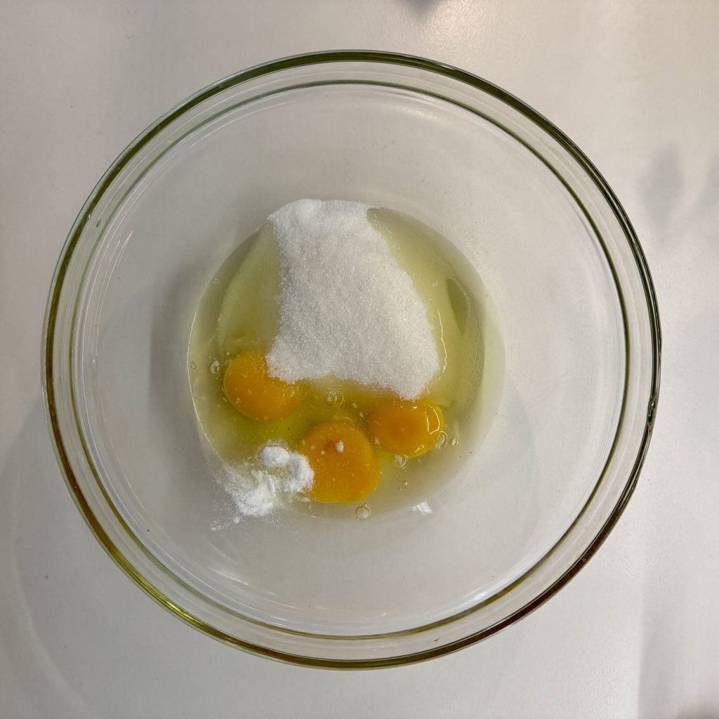 Dans un bol, mettez les œufs, le sucre, la vanilline et une pincée de sel.