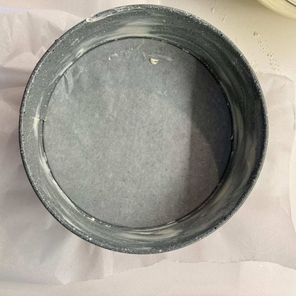 Tapissez le fond d’un moule à gâteau de 20 cm de diamètre avec du papier sulfurisé et beurrez les bords.