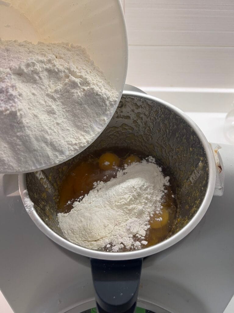 Ajoutez également les poudres : la vanilline, la farine, la fécule de pomme de terre et la levure chimique. Mixez 1 min vel 5.