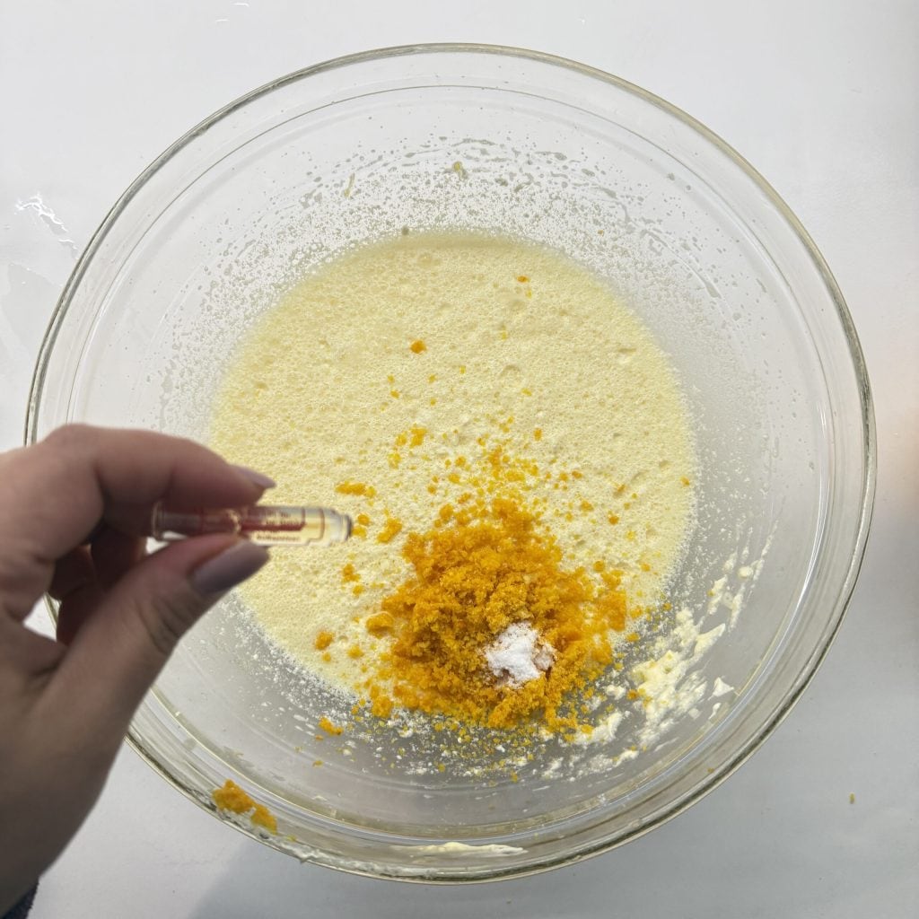 À ce stade, ajoutez les arômes : le flacon de rhum, le zeste d’orange et la vanilline. Mélangez avec les fouets.