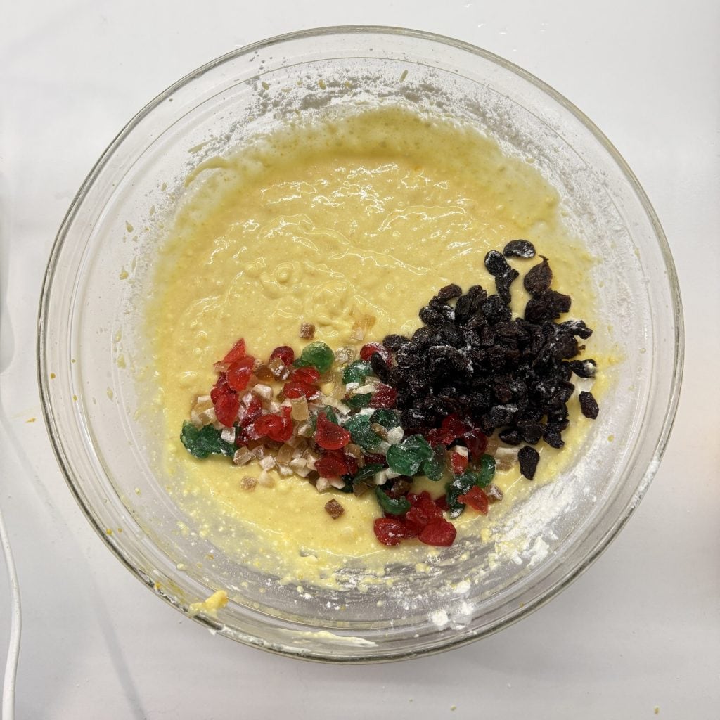 Ajoutez les raisins secs et les fruits confits. J’ai utilisé de l’orange confite et quelques cerises confites hachées.
