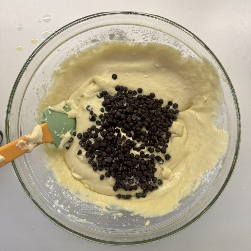 Pour finir, ajoutez les pépites de chocolat et la pomme nettoyée et coupée en petits morceaux. Gardez quelques morceaux de côté pour décorer la surface.