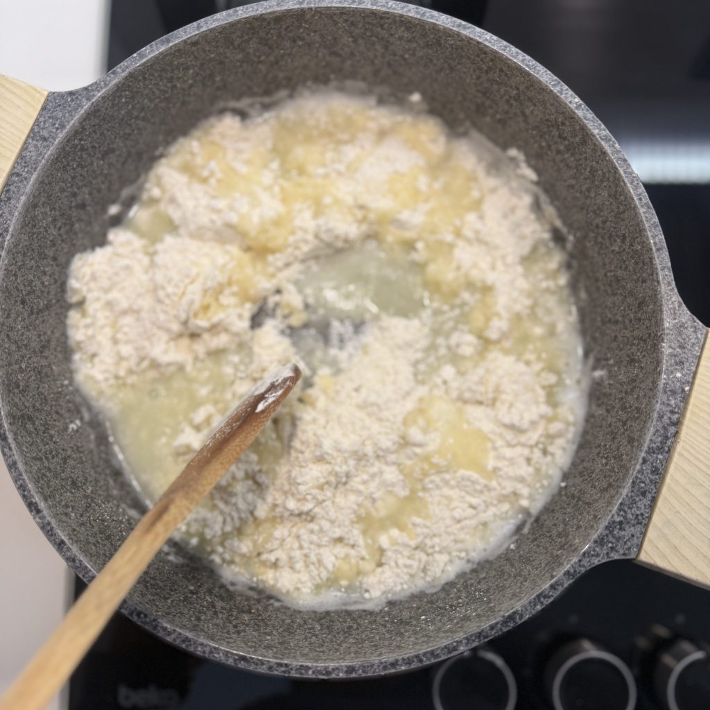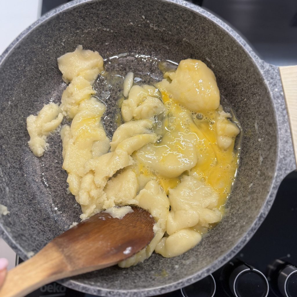Éteignez le feu, étalez légèrement la pâte pour qu’elle refroidisse plus rapidement et attendez 4-5 minutes.