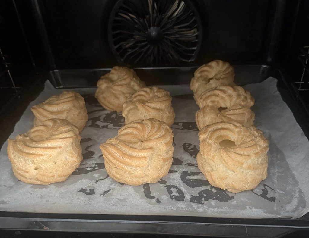 Une fois prête, préparez une poche à douille avec une grande douille étoile et remplissez-la de pâte à choux.Préchauffez le four à 190° ventilé et entre-temps prenez une plaque de cuisson, mettez-y un filet d’huile et posez dessus une feuille de papier sulfurisé. De cette façon, la feuille ne bougera pas.