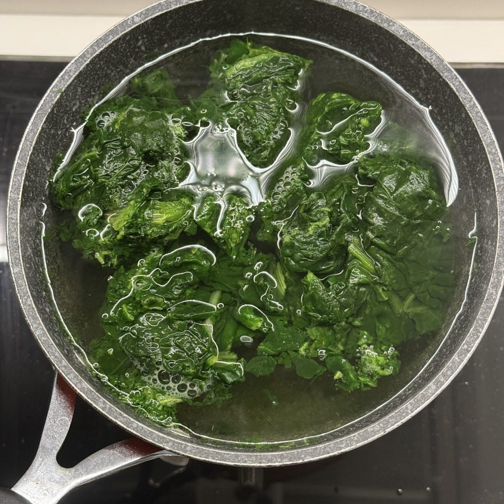 Tout d’abord, faites cuire les épinards dans une casserole d’eau légèrement salée, égouttez-les et laissez-les quelques minutes dans une passoire pour éliminer le plus d’eau possible. Une fois tiédis, pressez-les avec vos mains pour que les épinards libèrent le plus de liquide possible.