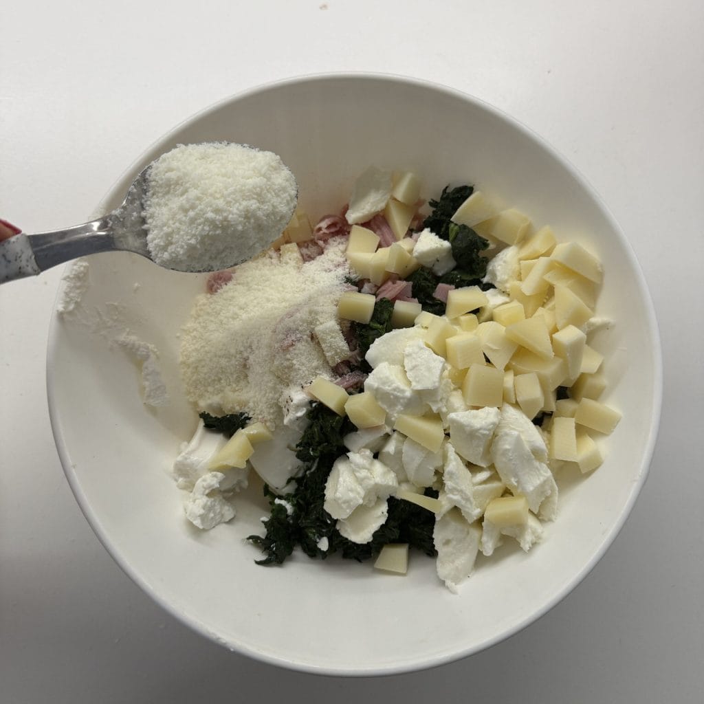 Ajoutez ensuite les épinards bien pressés. Selon votre goût, vous pouvez les laisser tels quels ou les couper.Je vous conseille de les hacher avec des ciseaux de cuisine, car ils se répartissent mieux dans le reste de la garniture et vous éviterez d’utiliser d’autres appareils comme un mixeur ou un mixeur plongeant.