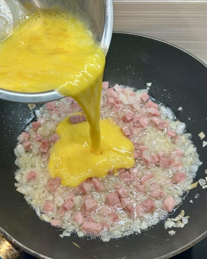 Versez-les dans la poêle avec l’oignon et les dés de jambon cuit.