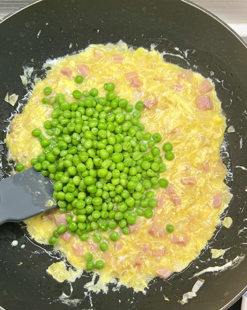 Après quelques minutes, ajoutez également les petits pois et continuez la cuisson jusqu’à ce que les œufs soient complètement pris.