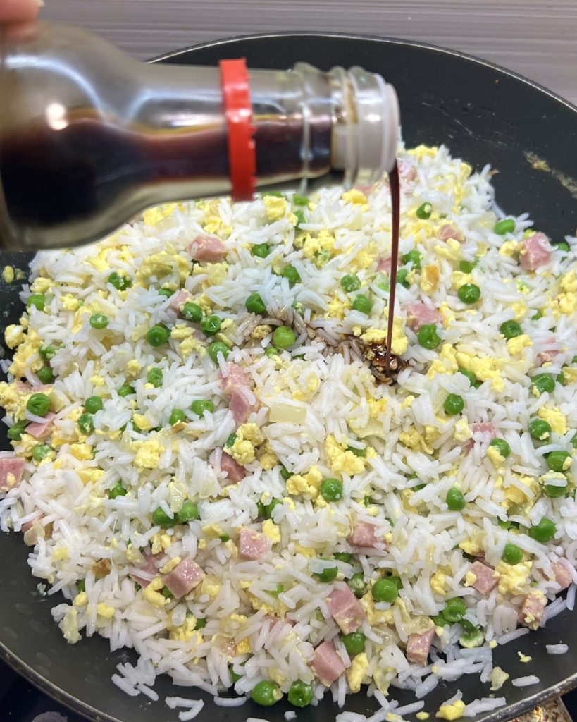 Pour finir, vous pouvez assaisonner le riz cantonais avec de la sauce soja. La quantité est à votre goût, mais surtout si c’est un assaisonnement que vous n’utilisez pas souvent, je vous conseille d’en mettre peu à la fois pour le doser correctement et éviter que son goût ne soit trop prononcé.