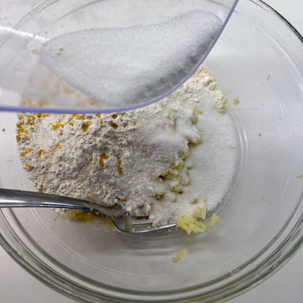 Ajoutez la farine 00, la semoule et le zeste râpé de l’orange.