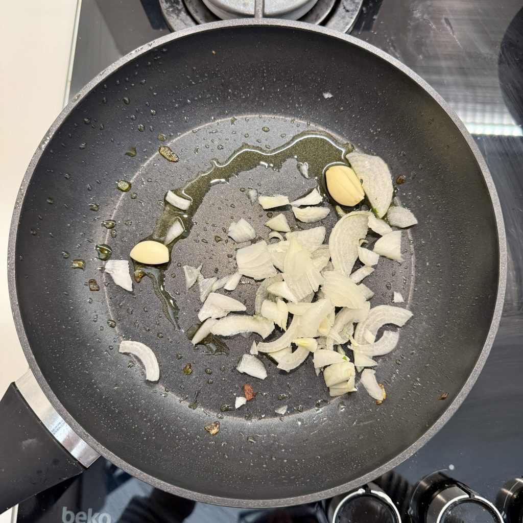 Dans une poêle, mettez 2-3 cuillères à soupe d’huile d’olive extra vierge, une gousse d’ail entière pelée et l’oignon coupé en fines tranches.