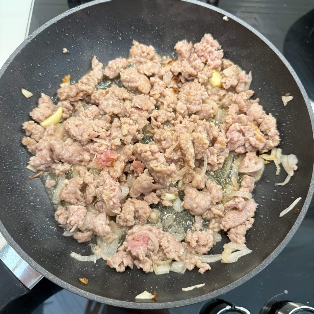 Allumez le feu à feu moyen et faites cuire pendant 4-5 minutes. Remuez de temps en temps avec une cuillère en bois et essayez d’émietter encore mieux la saucisse.