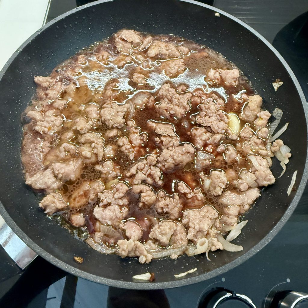 Lorsque la saucisse est presque cuite, versez un demi-verre de vin rouge et laissez évaporer jusqu’à ce que presque tous les liquides soient évaporés. Si vous n’avez pas de vin rouge ou préférez ne pas en mettre, aucun problème. Vous pouvez sauter cette étape et passer directement à l’étape suivante.