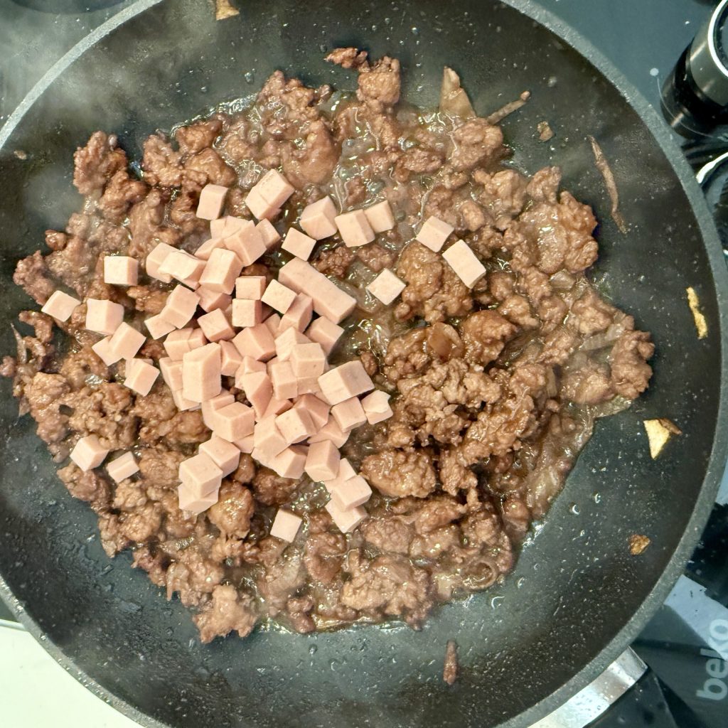 Ajoutez les dés de jambon cuit et laissez aromatiser pendant quelques minutes.