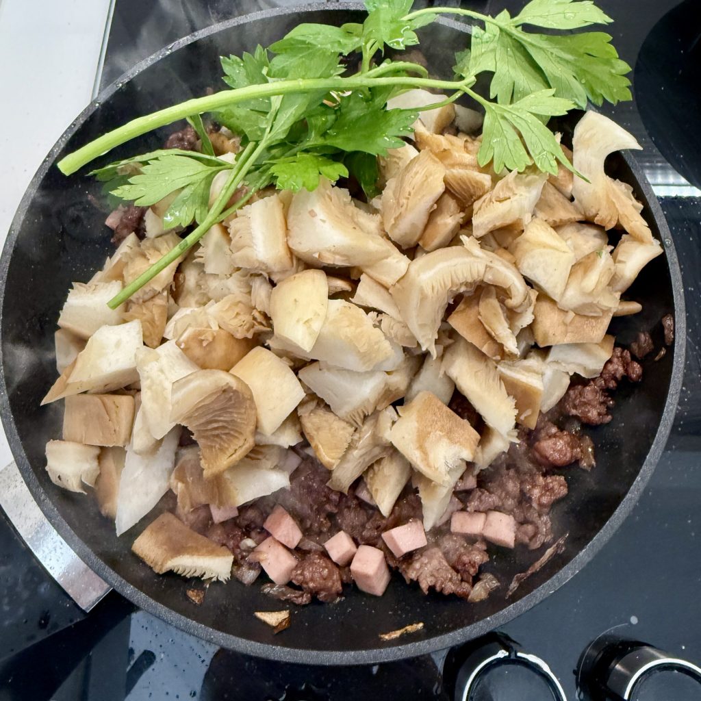 Ajoutez dans la poêle les champignons et une branche de persil.