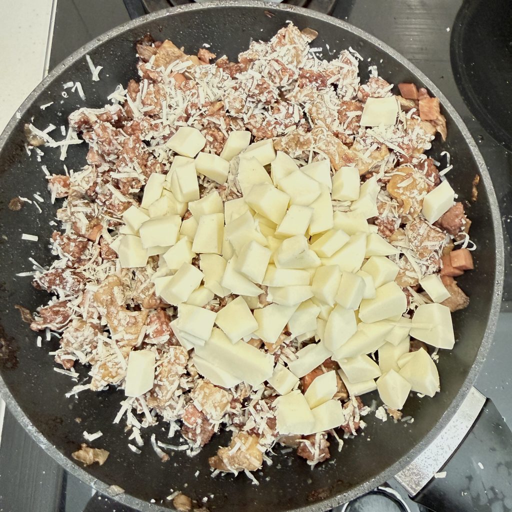 Une fois refroidie, vous pouvez terminer la garniture directement dans la poêle, sans salir d’autres bols ou contenants. Ajoutez le fromage râpé : vous pouvez choisir d’utiliser du parmesan ou, pour un goût plus prononcé, vous pouvez utiliser du pecorino romano râpé.