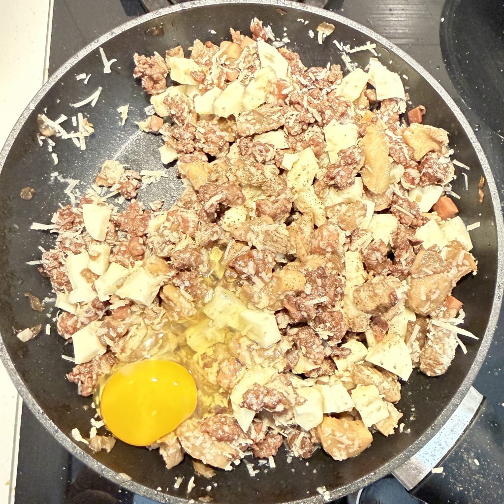 Ajoutez également la scamorza en dés. Pour finir, ajoutez un œuf.