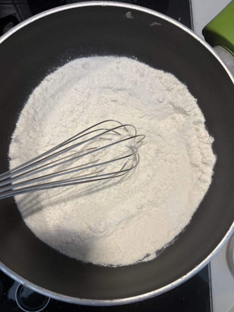 Dans une casserole, mettez le sucre et la farine tamisée.Mélangez les poudres.