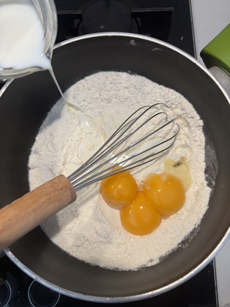 Ajoutez également les jaunes d’œufs et une petite quantité de lait (prélevée sur le total) pour amalgamer le mélange.