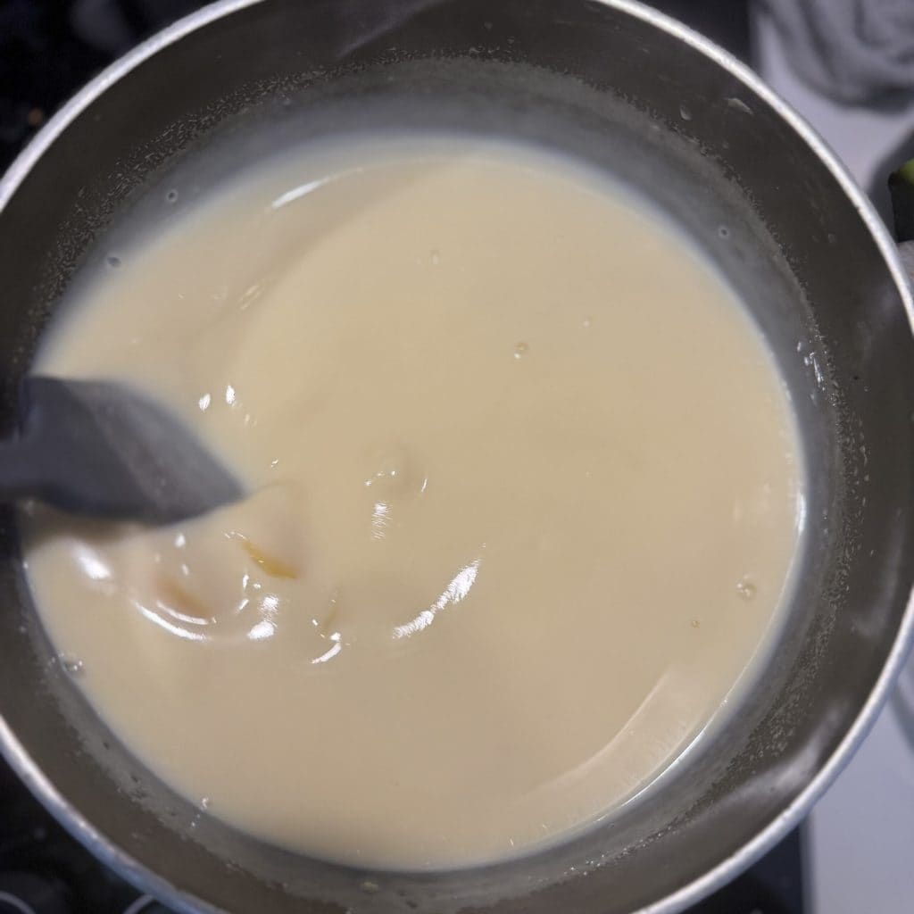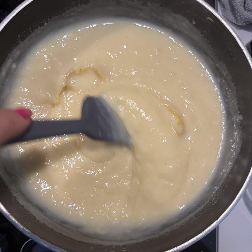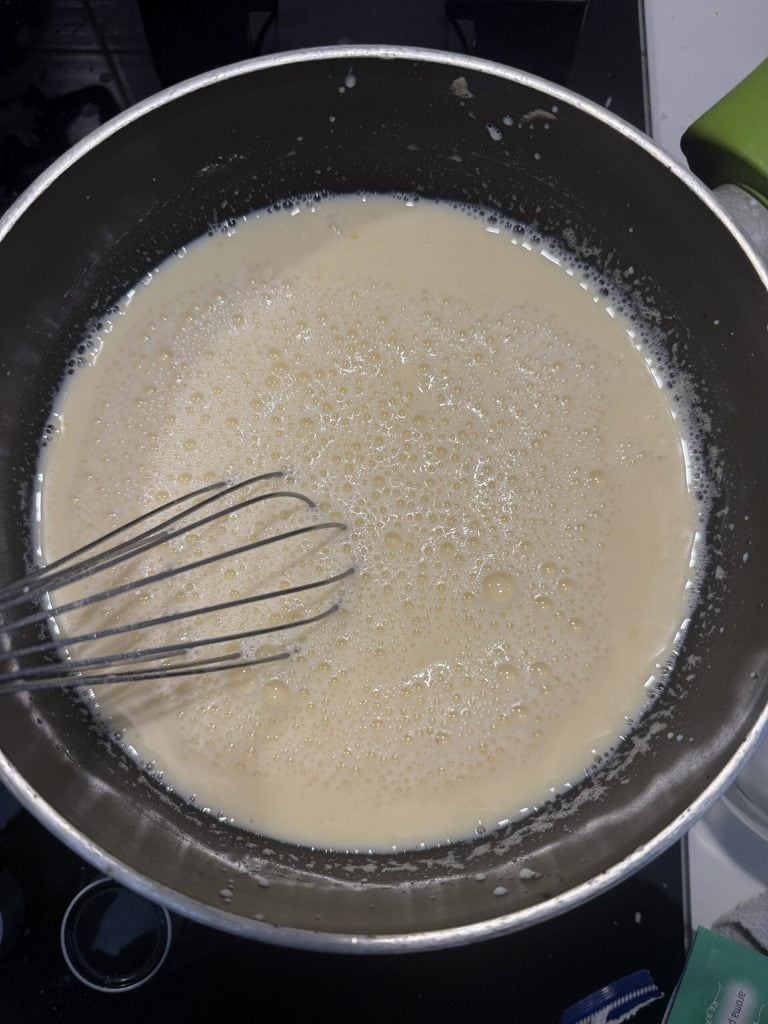 Avec une spatule en silicone, mélangez en continu. La crème commencera à s’épaissir de plus en plus.Lorsqu’elle commencera à faire des bulles, elle sera prête.