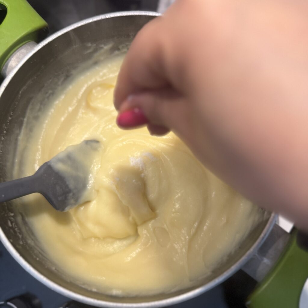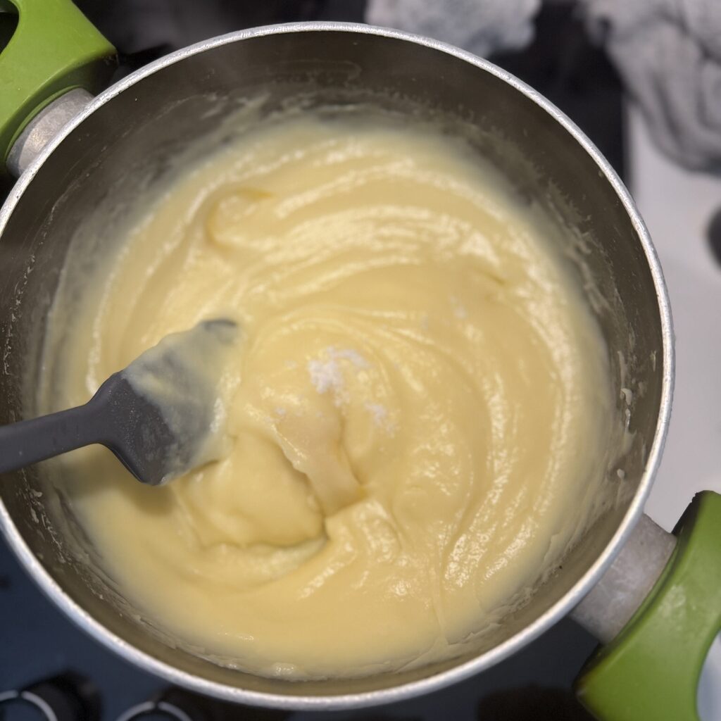 • Pendant que vos zeppole se refroidissent, préparez une crème pâtissière plus épaisse et structurée que la classique, car elle devra conserver la forme de la spirale sur la zeppola.