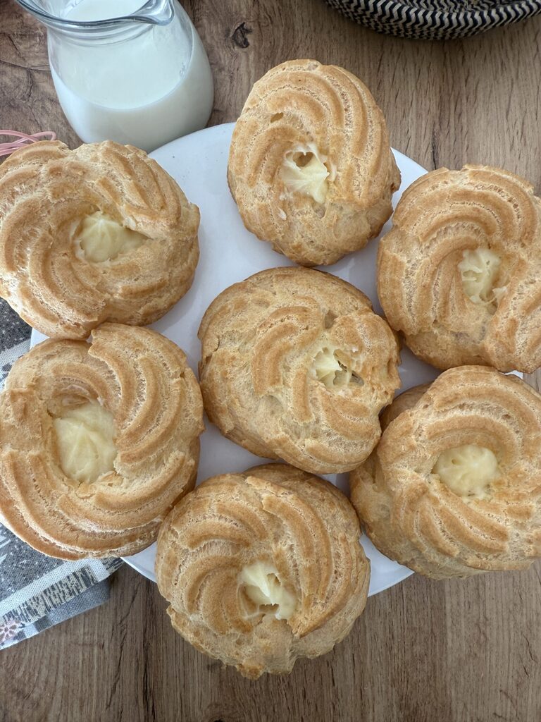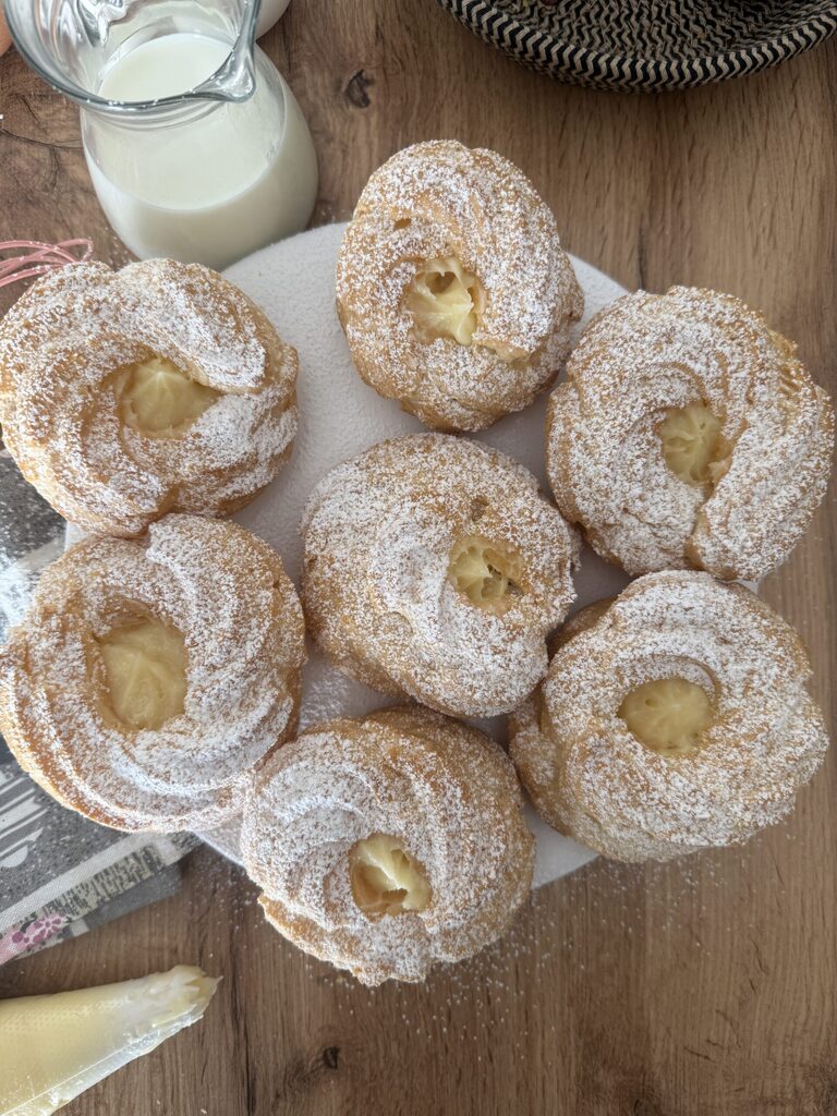 • Pour garnir les zeppole au four, vous pouvez soit les couper horizontalement et les garnir, soit, comme je l’ai fait, insérer la douille de la poche à douille dans le trou central des zeppole et les garnir avec un peu de crème à l’intérieur.