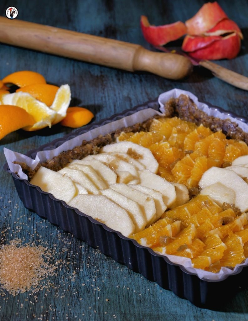 Il ne nous reste plus qu’à allumer le four à 180°, ventilé, et à couper les fruits. Nous épluchons donc les pommes et les oranges et les coupons en tranches régulières. Nous les disposons soigneusement sur la pâte, en formant le motif qui nous plaît le plus. Enfin, nous ajoutons le gingembre de manière régulière et saupoudrons le tout de sucre de canne.