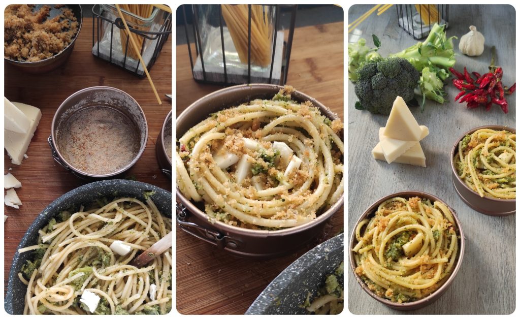 Égouttons les bucatini al dente et assaisonnons-les directement dans la poêle, avec les brocoletti sautés (je vous recommande de retirer les gousses d’ail et le piment si nous l’avons mis entier). Ajoutons le pain atturrato, pas tout d’un coup mais petit à petit ; les bucatini doivent rester sableux. Ajoutons également le provolone doux en petits morceaux. Ensuite, à l’aide d’une grande fourchette, disposons les bucatini dans le moule pour former un nid. Au centre, ajoutons quelques morceaux du fromage que nous avons conservé. Enfin, ajoutons encore un peu de chapelure assaisonnée et un petit bobine de pâte pour fermer.