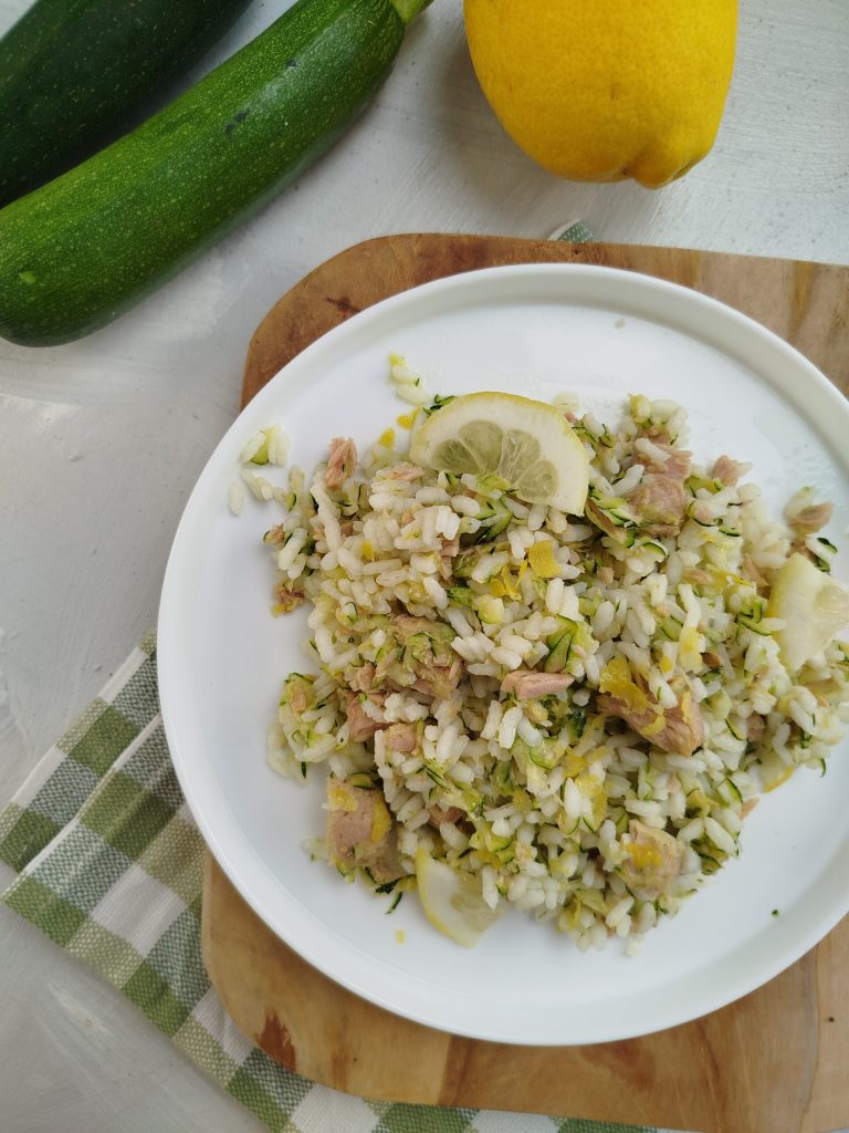 Salade de riz aux courgettes et thon, fraîche et légère, parfaite pour un repas rapide, un pique-nique ou pour emmener à la plage. C’est une recette très rapide, juste le temps de cuire le riz, on mélange le tout et voilà le plat est prêt à être dégusté.