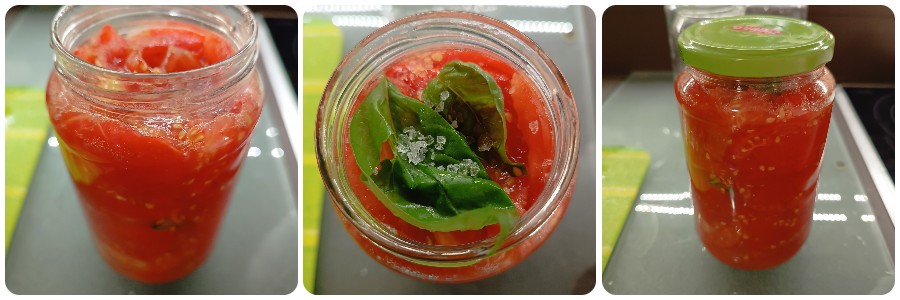Complétez avec une ou deux feuilles de basilic et un peu de gros sel. Si les tomates ont libéré trop d’eau, je vous conseille d’en retirer un peu. Continuez ainsi avec tous les autres bocaux.