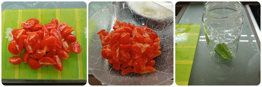 Coupez-les en tranches ou en morceaux (comme vous préférez), et rassemblez-les dans un grand récipient. Une fois cette opération terminée, prenez un des bocaux stérilisés et insérez environ 2 feuilles de basilic frais (selon leur taille).