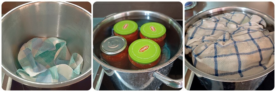Préparez une grande casserole sur le feu et placez un torchon à la base. Ensuite, déposez les bocaux sur la base, et couvrez avec un autre torchon pour éviter que les bocaux ne se cognent entre eux. Ajoutez suffisamment d’eau pour dépasser le niveau des bocaux, fermez avec un couvercle, puis allumez le feu et dès que ça bout, laissez cuire pendant une heure et demie à feu moyen-doux, en veillant à ce qu’il ne perde pas l’ébullition.